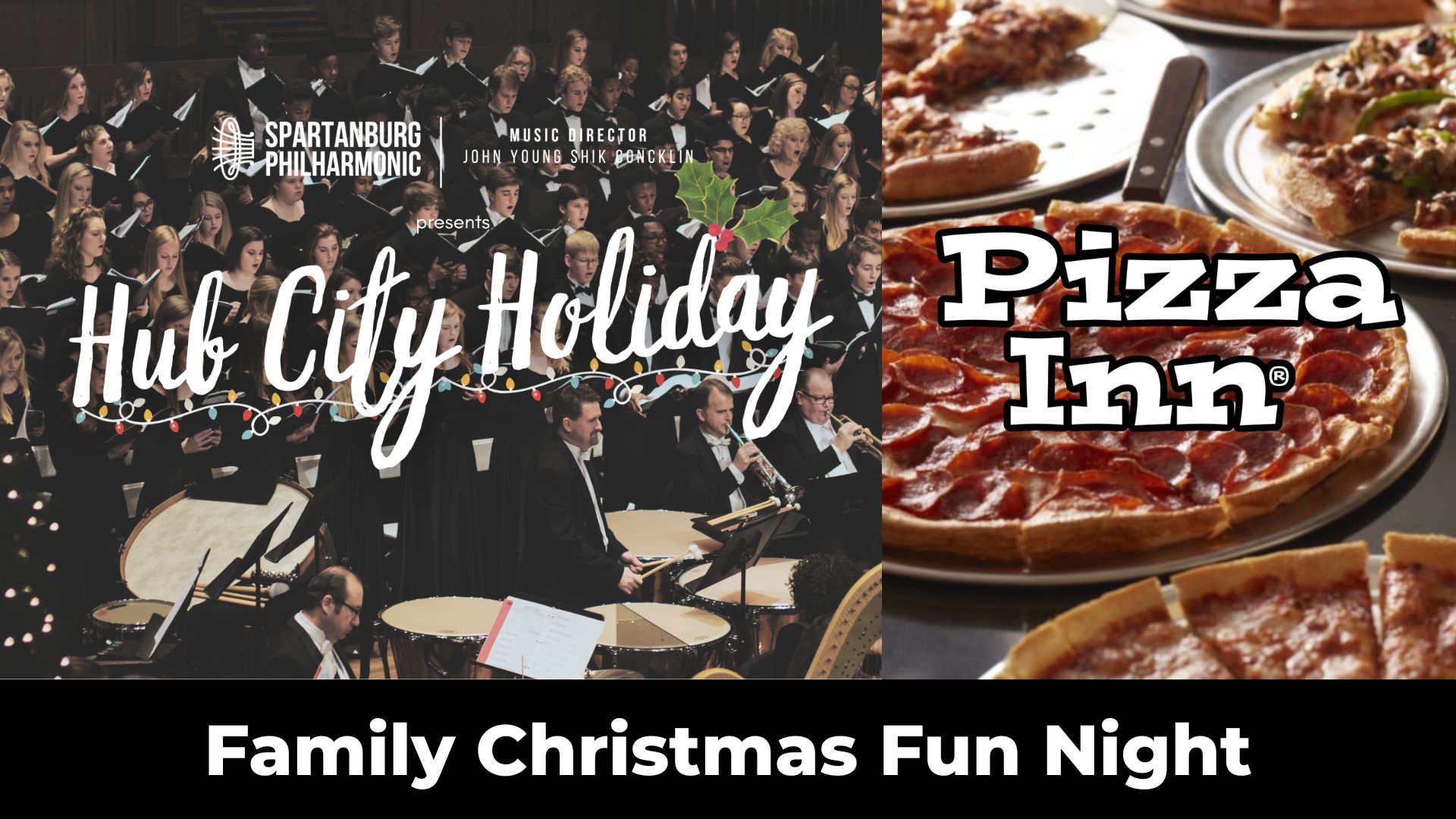 Four (4) tickets to the Spartanburg Philharmonic Hub City Holiday Concert on Saturday, Dec 6th, 2025 at Twitchell Auditorium (Section F1 Center Left / Row R / Seat 122/124/126/128), plus four (4) free adult buffet cards from Pizza Inn.