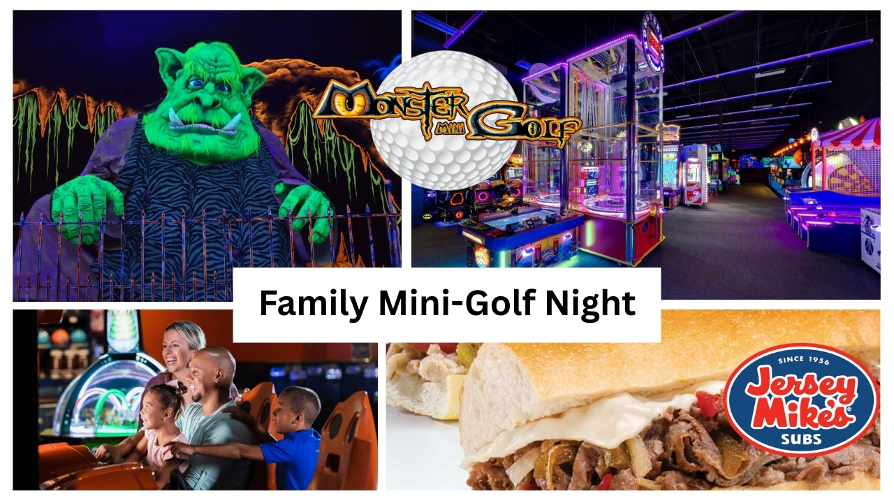 Four (4) free rounds of mini-golf at Monster Mini-Golf, a $25 arcade card, plus four (4) subs from Jersey Mike’s Subs